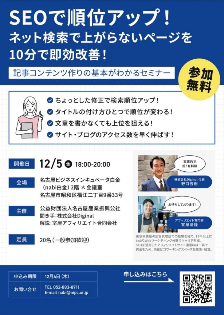 12月5日「SEOで順位アップ!ネット検索で上がらないページを10分で即効改善!」のお知らせ