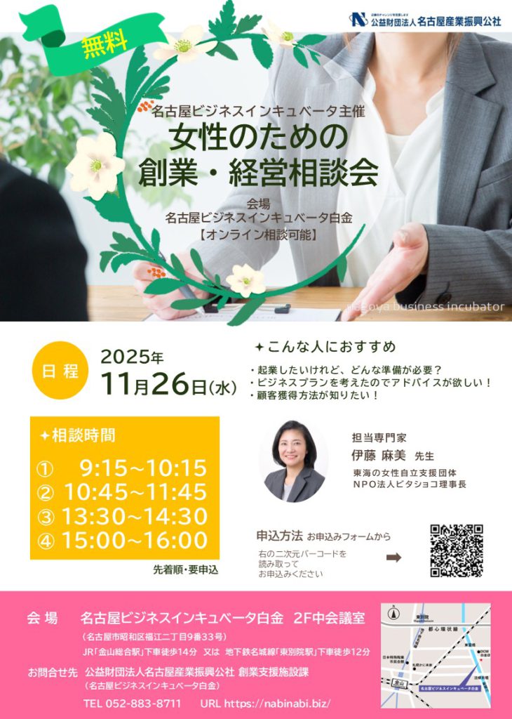 令和7年11月26日(水)、名古屋ビジネスインキュベータ主催、女性限定の相談会です。