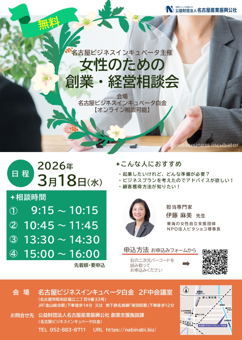 令和8年3月18日(水)、名古屋ビジネスインキュベータ主催、女性限定の相談会です。